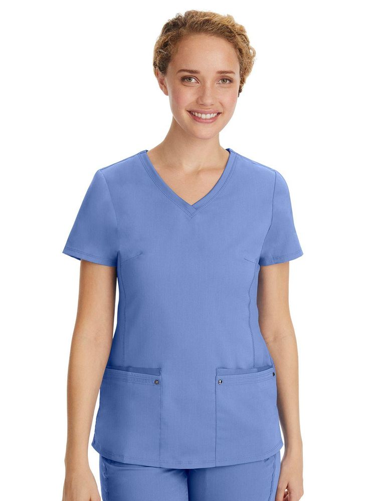 • The Purple Label Yoga line by Healing Hands Scrubs is the next step in performance and comfort for scrubs. The signature Purple Label easy care Poly/Rayon blend fabric is durable while still feeling luxurious on the skin. With added features inspired by Yoga activewear, Purple Label Yoga scrubs are made to feel like workout wear while still looking professional. The "Juliet" top features a stylish v-neck with stretch knit side panels, 2 patch pockets, and ribbon and grommet details for style. 77% Polyester/20% Rayon/3% Spandex. Classic fit. Center back length: 25" • THE WORLD’S BEST FABRIC: Our Purple Label collection features a superior polyester-rayon-spandex stretch fabric blend that is lightweight, soft, and breathable. The polyester makes our uniforms incredibly strong, wrinkle free, and resists fading. The rayon is wonderfully soft and gives you a great fit, and our spandex is specially made to last and give you superior stretch and maximum recovery. Finally, the easy-care fabric is a breeze to clean. Just throw it in the wash and it’s good as new. • MODERN DESIGN WITH MAXIMUM DURABILITY: Our Juliet top gives you the look you want with the durability you need. Featuring a contemporary fit with a stylish knit V-shaped neckline, the ribbon, grommets, and stitching details on the pockets will keep up with all your demands. Body length measurement (based on size small): 27” • FASHION MEETS PERFORMANCE: Featuring “Wash and Wear” performance and durability, this top is crafted with stylish form-fitting details to give you an incredible fit that looks great. Our superior dyes and special jet dyeing process gives a deep color saturation that lasts. Our quality control ensures that our colors match perfectly for any Purple Label scrub. Adding a touch of versatility to your uniform, this knit V-neck top easily transitions from work to relaxation. • PLENTY OF STORAGE: The Juliet medical scrub top has two deep front pockets, perfect for nearly any accessory you want right at your fingertips. No matter where you work or what your job is, we know you’ll appreciate lots of pocket space. • THOSE WHO CARE WEAR: healing hands strives to provide the most durable, comfortable uniforms ever made. We turn our luxurious fabrics into stylish uniforms that fit and flatter naturally with no added ironing, giving you the best value you can find anywhere. Many of our uniforms have hidden messages from our founder printed inside, showing appreciation for all the professionals who wear our scrubs to work every day.