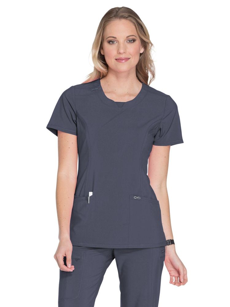 • A Contemporary fit round neck top with a rib-knit inset at the front neckband also features shoulder yokes, a bungee ID badge loop on the right shoulder, front and back princess seams, two patch pockets, one interior pocket, and side vents. Stretch rib-knit at the center back panel gives this top its slimming shape and allows for extra movement and comfort. Coverstitch detail throughout. Center back length: 26". The comfortable stretch poplin fabric and super stretchy rib-knit is the perfect combo for healthcare professionals. • Contemporary fit • Three pockets: two patch pockets, interior pocket • Rib-knit inset at front neckband and back panel • Shoulder yokes, Bungee ID badge loop • Side vents