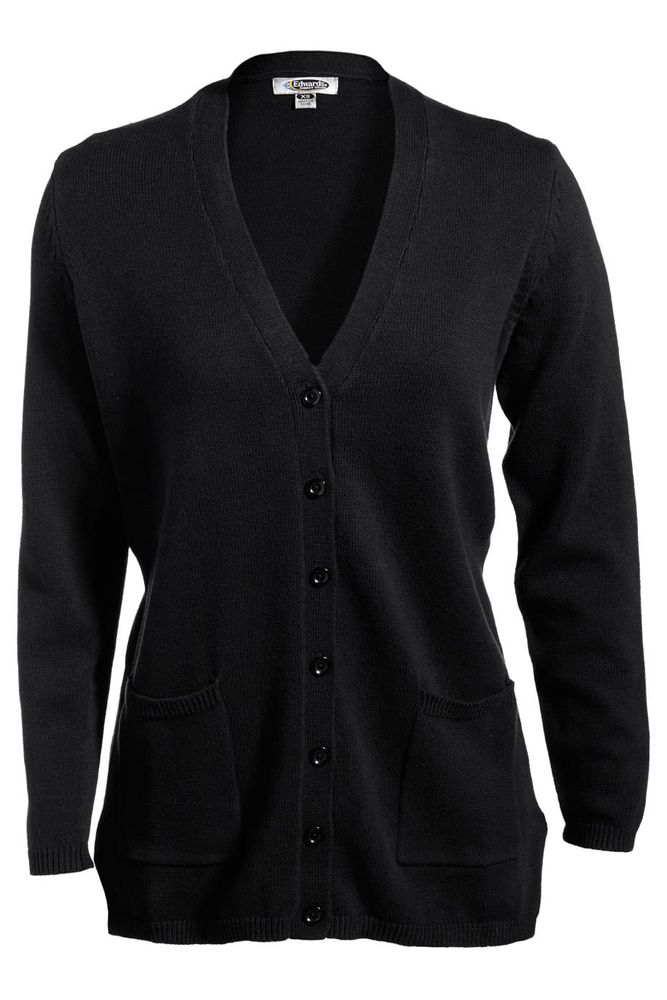 Long v-neck cardigan flatters a woman's curves. Perfect for the office, this soft cotton cardi is stylish and functional. Embroiders well.