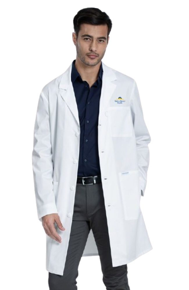 This Unisex Modern fit lab coat features notched lapels, a four button front closure, back yoke seams and back side panels. There are three pockets: one chest pocket with a bungee ID badge loop and two front tablet pockets with side entry for easy access to pant pockets. Center back length: 38"
